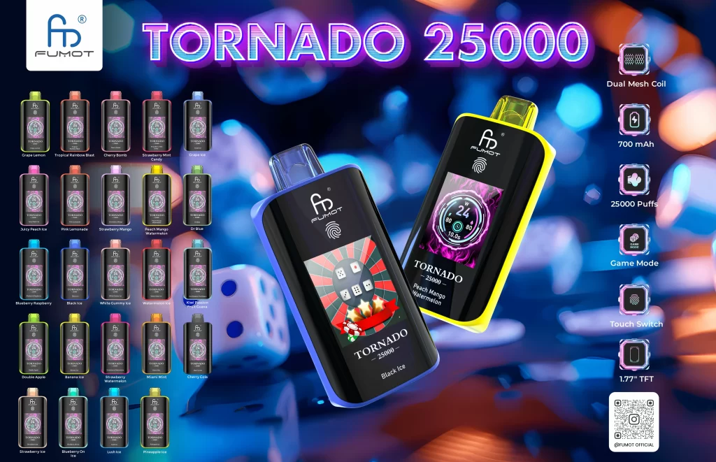 Elevate your vaping experience with the Fumot Tornado 25K Puffs – a cutting-edge disposable vape engineered for endurance and customization. Boasting an industry-leading 25,000 puffs and a massive 20ml pre-filled capacity, this powerhouse is driven by a 700mAh rechargeable battery with Type-C fast charging for uninterrupted sessions.