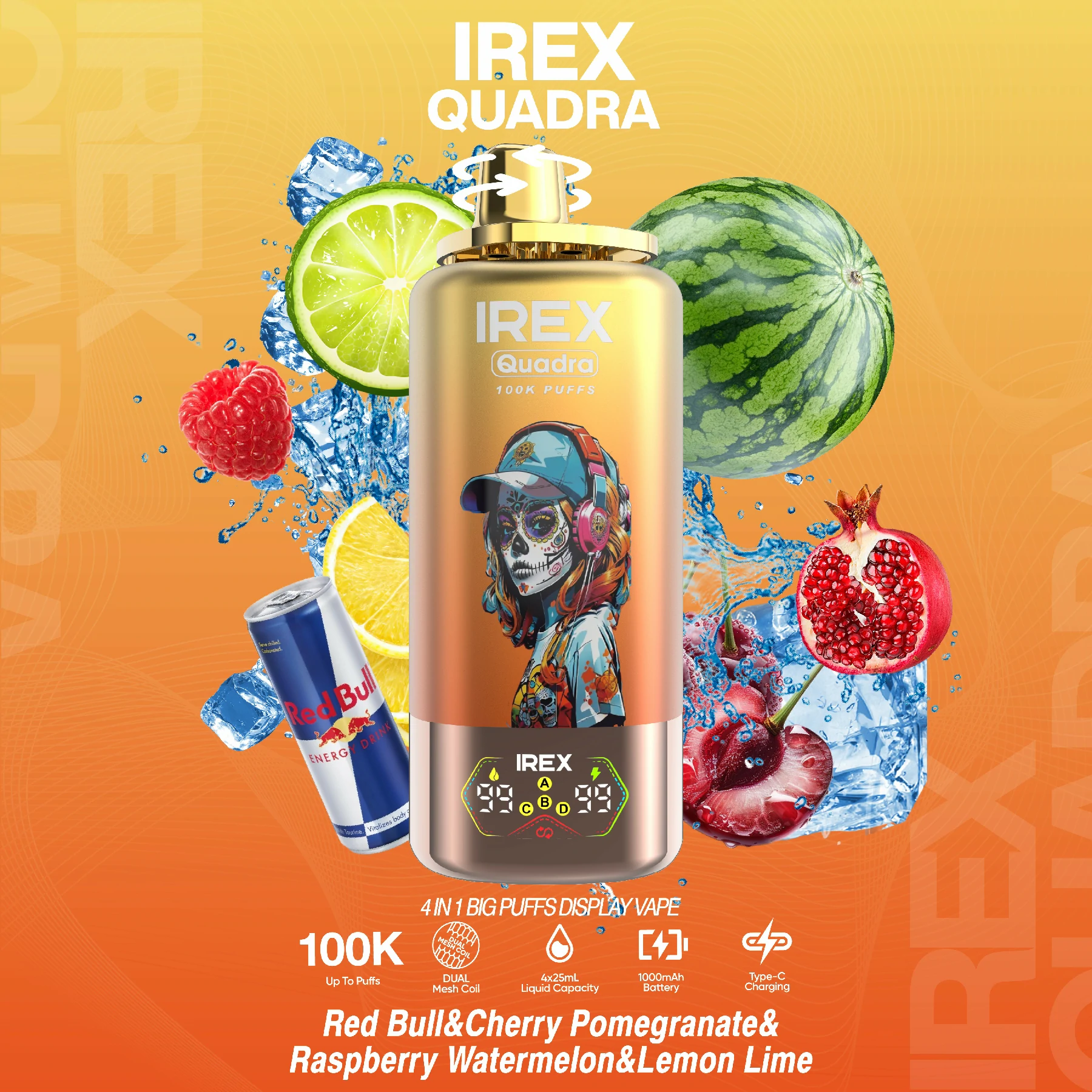 Introducing the IREX Quadra 100K Puffs – a groundbreaking 4-in-1 disposable vape pen that redefines versatility and longevity. With 4 pre-filled pods (25ml each) totaling 100ml of e-liquid, this innovative device delivers an unprecedented 100,000 puffs, making it the ultimate choice for vaping enthusiasts seeking variety and endurance.